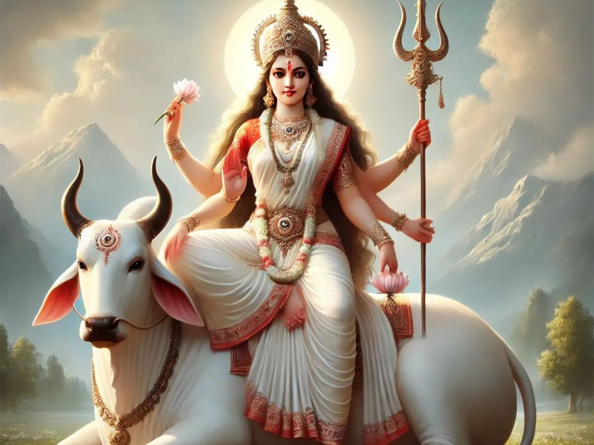 अर्थ – “मैं माँ शैलपुत्री को वंदना करता हूँ, जो इच्छित फल देती हैं, जिनके सिर पर अर्धचंद्र सुशोभित है, जो वृषभ (साँड़) पर सवार हैं, त्रिशूल धारण किए हुए हैं और यशस्विनी (यशस्वी) हैं”.
