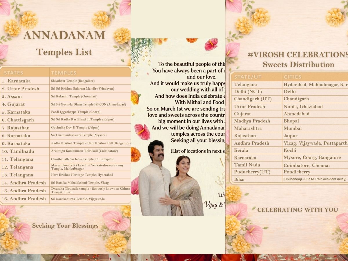 रश्मिका मंदाना और विजय देवरकोंडा ने अपनी-अपनी इंस्टाग्राम स्टोरी के नोट में लिखा कि इस देश के खूबसूरत लोगों के लिए. आप हमेशा हमारी जर्नी और हमारे प्यार का हिस्सा रहे हैं. और आप सभी के साथ अपनी शादी का जश्न मनाना हमें सच में बहुत खुशी देगा और भारत सब कुछ कैसे मनाता है? मिठाई (मिठाई) और खाने (स्माइली फेस इमोजी) के साथ. तो 1 मार्च को हम अपनी जिंदगी के इस बड़े पल को आप सभी के साथ शेयर करने के लिए देश भर में प्यार और मिठाई से भरे ट्रक भेज रहे हैं और हम देश भर के कई मंदिरों में अन्नदान करेंगे. आप सभी का आशीर्वाद चाहते हैं. प्यार के साथ, विजय और रश्मिका.