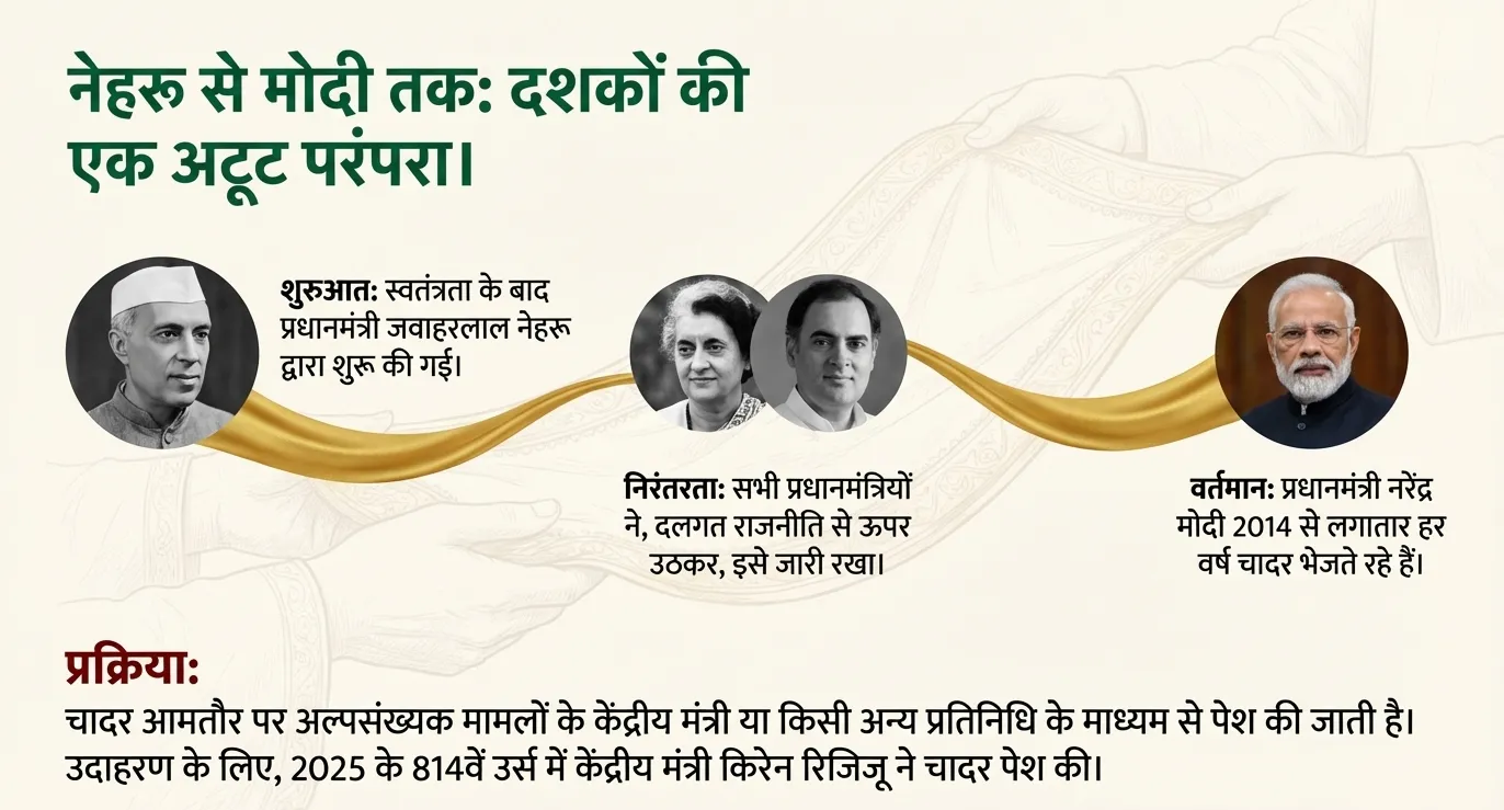 पीएमओ की ओर से अजमेर शरीफ में ख्वाजा मोइनुद्दीन चिश्ती के सालाना उर्स के मौके पर चादर चढ़ाने की परंपरा लंबे समय से चली आ रही है. ये परंपरा आजादी के बाद से शुरू हुई थी. तब पहली बार तत्कालीन प्रधानमंत्री जवाहर लाल नेहरू ने अजमेर शरीफ पर चादर भेजा था. नेहरू के बाद इस परंपरा को इंदिरा गांधी, राजीव गांधी सहित सभी प्रधानमंत्रियों ने इसे जारी रखा.