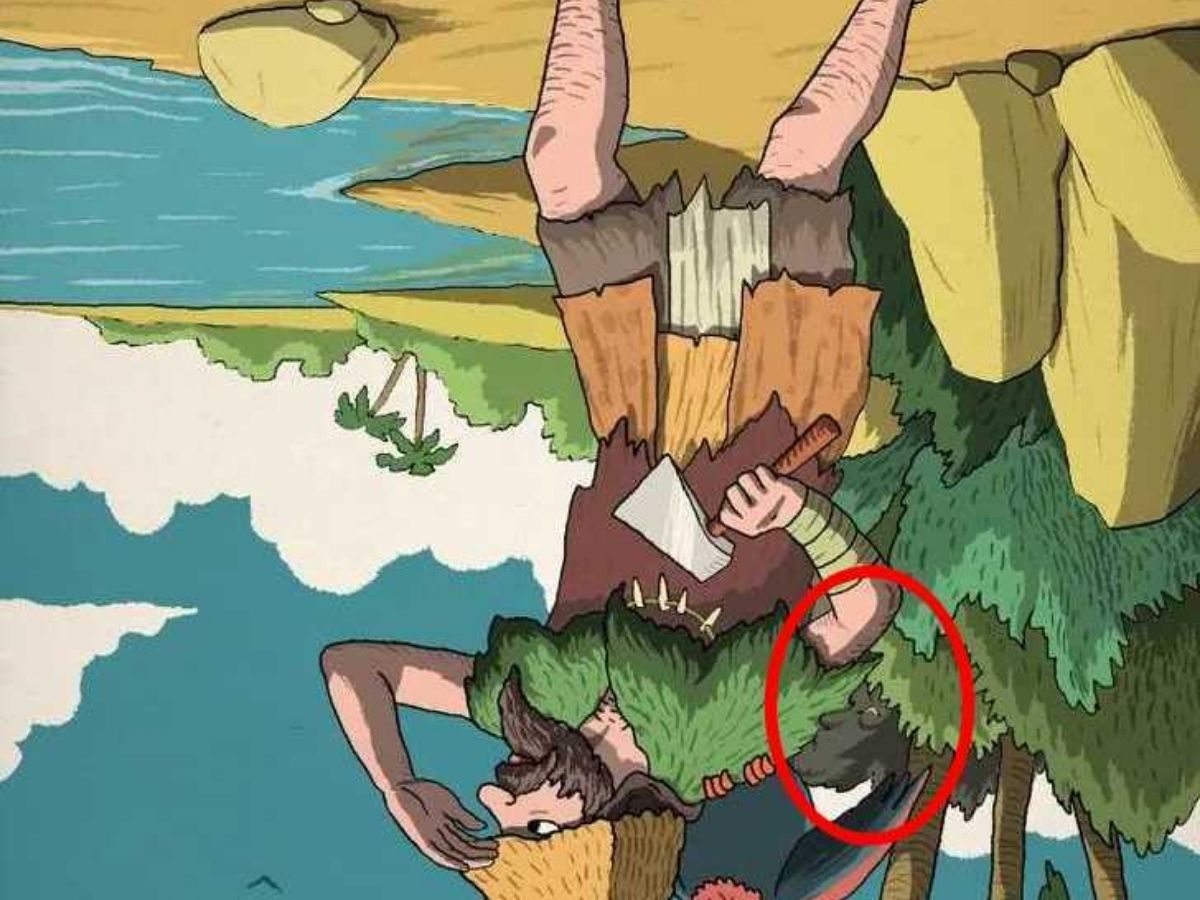 इस तस्वीर में एक ‘टापू का दृश्य’ दिखाई दे रहा है. एक आदमी हाथ में ‘कुल्हाड़ी’ लिए खड़ा है और उसके कंधे पर एक ‘पक्षी’ बैठा हुआ है. ऐसा लगता है जैसे वह कोई एक्सप्लोरर है और किसी को ढूंढ रहा है.लेकिन असली ट्विस्ट यही है कि जिस दोस्त को वह ढूंढ रहा है, वह इसी तस्वीर में छिपा हुआ है.