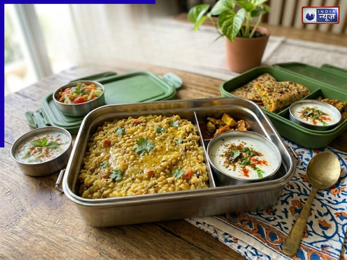 1 भाग चावल, 1 भाग मूंग दाल, हल्दी, नमक, गाजर-मटर-बीन्स डालकर प्रेशर कुकर में 2-3 सीटी तक पकाएं. घी में जीरा, हींग का हल्का तड़का ऊपर से डाल दें (बहुत मिर्च न डालें). साथ में खीरे का रायता पैक करें.