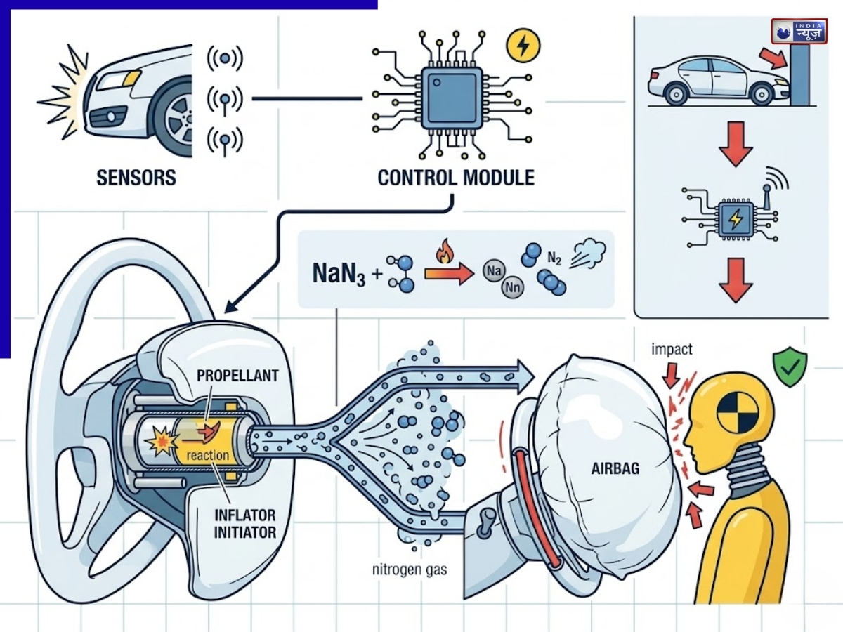 कार के सेंसर जैसे ही संकेत देते हैं एयरबैग्स में नाइट्रोजन वाला रिएक्शन शुरु हो जाता है. टक्कर होते ही यह बहुत ज्यादा तेजी से यह गैस एयरबैग्स को फुला देती है, जिससे यात्रियों की जान बच जाती है.
