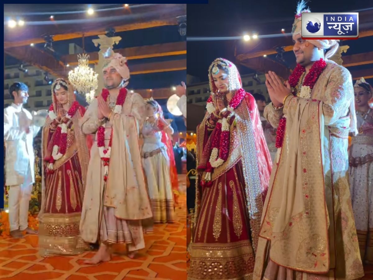 रात में इंद्रेश उपाध्याय और शिप्रा शर्मा की जयमाला सेरेमनी हुई जिसमें दोनों दूल्हा-दुल्हन ने पारंपरिक और शाही आउटफिट्स पहने हुए नजर आएं. लाल जोड़े में शिप्रा किसी रानी से कम नहीं लग रही थी. वहीं दूल्हे राजा भी किसी राजा-महाराजा से कम नजर नहीं आ रहे थे.