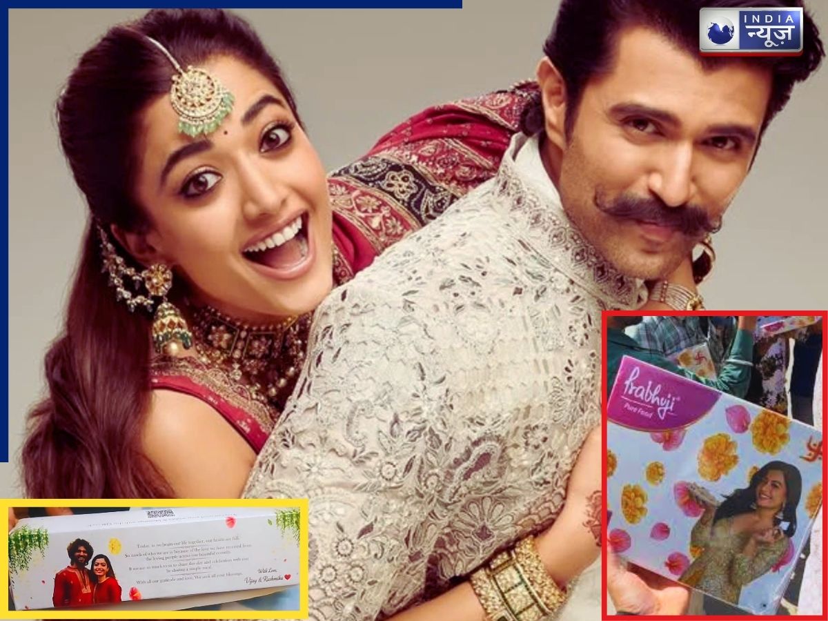 Rashmika Vijay Sweet Box: हाल ही में दो सुपरस्टार्स ने शादी की जिसकी चर्चा पूरे देश में छाई रही. बता दें कि रश्मिका मंदाना और विजय देवराकोंडा की शादी की चर्चा ने सभी का ध्यान खींचा. दोनों ने राजस्थान के एक नेचुरल वाली जगह पर काफी कम मेहमानों के बीच शादी को पूरा किया. उनके एक फैन ने शादी की मिठाई के डिब्बे का अनबॉक्सिंग किया जो काफी वायरल हो रहा है. चलिए जानते हैं उसके अंदर क्या था?