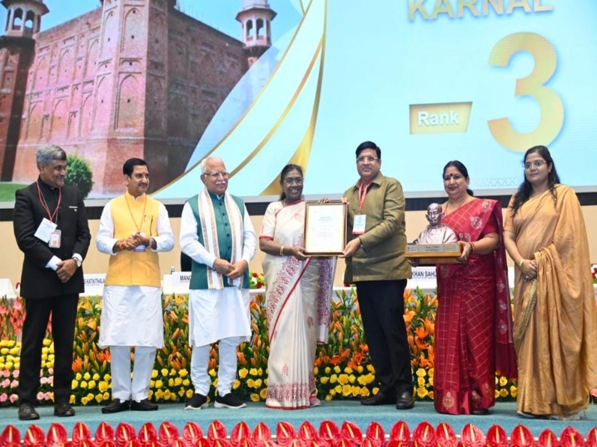 गुरुवार को नई दिल्ली स्थित विज्ञान भवन में राष्ट्रपति द्रौपदी मुर्मू ने हरियाणा शहरी स्थानीय निकाय मंत्री विपुल गोयल, महापौर रेनू बाला गुप्ता व नगर निगम आयुक्त डॉ. वैशाली शर्मा को प्रमाण पत्र व राष्ट्रपिता महात्मा गांधी की प्रतिमा देकर सम्मानित किया। मंच पर राष्ट्रपति के साथ केंद्रीय आवासन एवं शहरी मामले मंत्री मनोहर लाल, इसी मंत्रालय के राज्य मंत्री व सचिव उपस्थित थे। सुपर स्वच्छ शहर श्रेणी में मध्य प्रदेश का देवास प्रथम, 11692 अंक तथा महाराष्ट्र के करहड़, 11088 अंक के साथ द्वितीय स्थान पर रहा है। यह पुरस्कार पाने वाला करनाल हरियाणा प्रदेश का पहला शहर बन गया है।